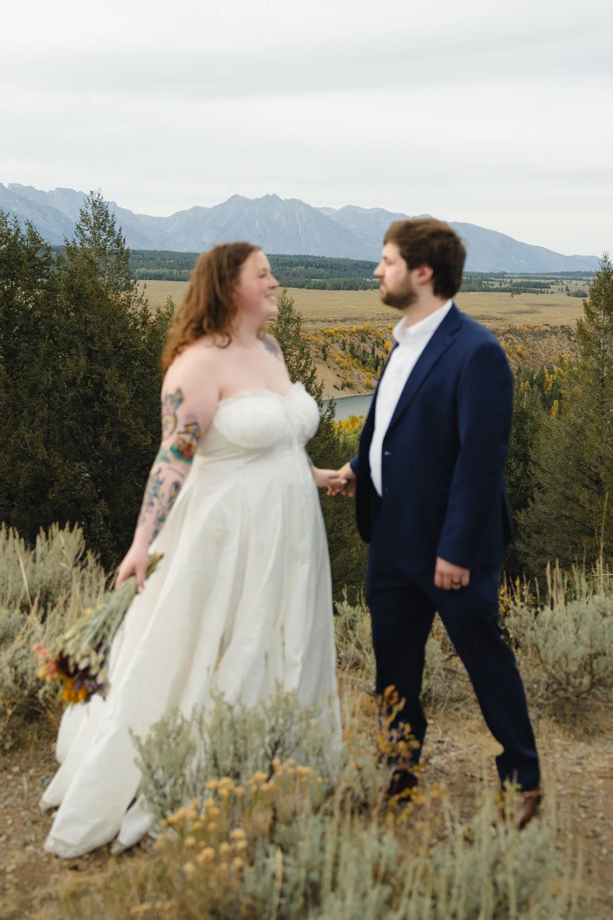 The Tetons can get hit hard by wildfire smoke (you can see the haziness a bit in my photos), however, so it’s a bit of a toss up whether you want to gamble on rain, snow, or smoke. The Snake River Overlook is a little far away from the Tetons and not being able to see the mountains on your wedding day is tragic, so earlier summer sessions will reduce your chances of getting smoked out.